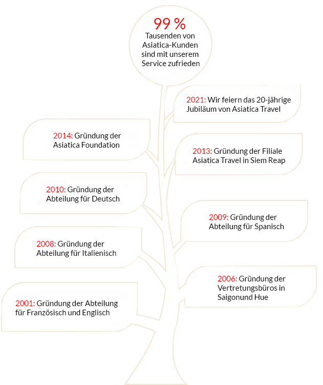 Planen Sie jetzt Ihre Rundreise durch Vietnam, Kambodscha, Laos & Thailand mit eigener Reiseleitung, eigenem Transport und persönlichen Reiserouten? Dann sind Sie an der richtigen Adresse. Asiatica Travel wurde 2001 in Vietnam gegründet und jetzt sind wir ein multinationales Unternehmen mit 100 Mitarbeitern in 4 Büros. Seither haben wir mehr als 25 Jahre lang Erfahrung und eine Spitzenposition unter den Reiseveranstaltern für individuelle und maßgeschneiderte Reisen in Vietnam, Kambodscha, Laos und Thailand eingenommen. Sie müssen keine Zeit damit verschwenden, alle Bewertungen im Internet zu lesen. Wir haben die am besten bewerteten Dienstleistungen für Ihre Reise getestet und ausgewählt. Gerne passen wir das Angebot an, bis Ihre Reisewünsche erfüllt sind.